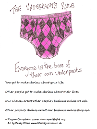 The Underpants Rule is simple: everyone is the boss of their own underpants so, when it comes to personal choices, you get to choose for you and other people get to choose from them and it’s not your job to tell other people what to do and it’s not their job to tell you what to do. To illustrate, if someone is considering saying something that starts with