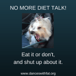 People are also allowed to choose NOT to try to lose weight for whatever reason we want – whether it’s because we believe that the research shows behavior, not body size, give us the best chance for health (knowing that health is not an obligation, barometer of worthiness, or entirely within our control), or because we believe that bullying and social stigma should be solved by ending bullying and social stigma, not by giving the bullies our lunch money, or because we believe the evidence about the near-complete futility of intentional weight loss. But this time of year that group doesn’t find much support.